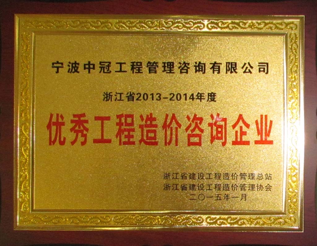 浙江省2013-2014年度優(yōu)秀工程造價咨詢企業(yè)-中冠榮譽-中冠咨詢-中冠工程管理咨詢有限公司