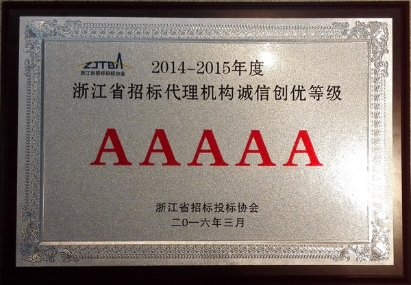 2014-2015年度浙江省招標(biāo)代理機(jī)構(gòu)誠(chéng)信創(chuàng)優(yōu)等級(jí)AAAAA