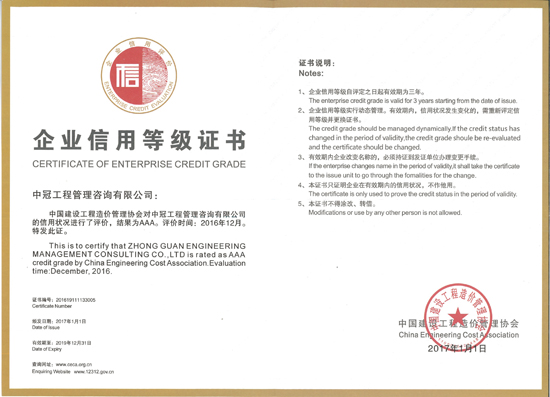 “中國(guó)建設(shè)工程造價(jià)管理協(xié)會(huì)企業(yè)信用評(píng)價(jià)AAA級(jí)信用企業(yè)”榮譽(yù)稱號(hào)