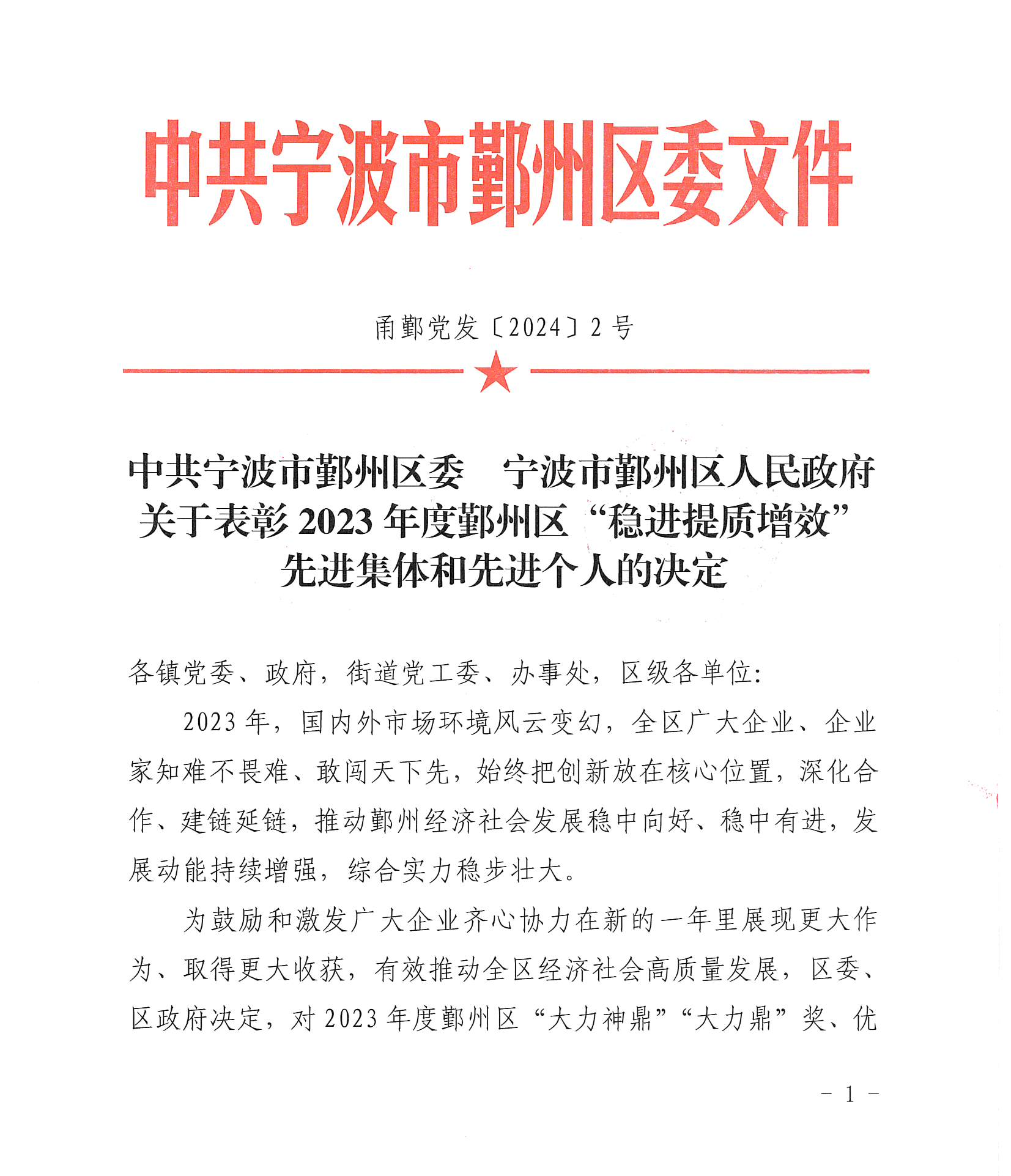 中冠喜報 | 我司獲評2023年度鄞州區(qū)“穩(wěn)進提質(zhì)增效”先進集體-優(yōu)秀企業(yè)