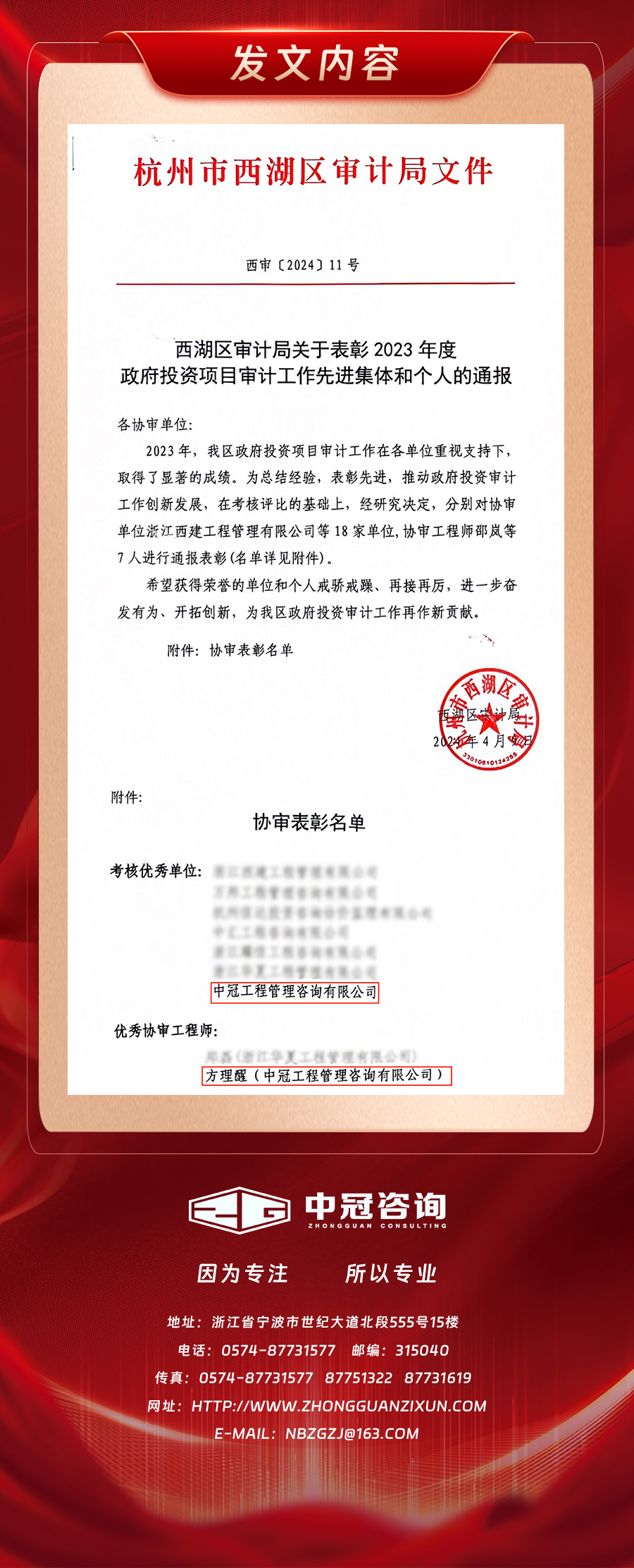中冠喜報 | 我司榮獲杭州市西湖區(qū)審計局2023年度政府投資項目審計工作先進(jìn)集體和個人表彰-中冠新聞-中冠咨詢-中冠工程管理咨詢有限公司