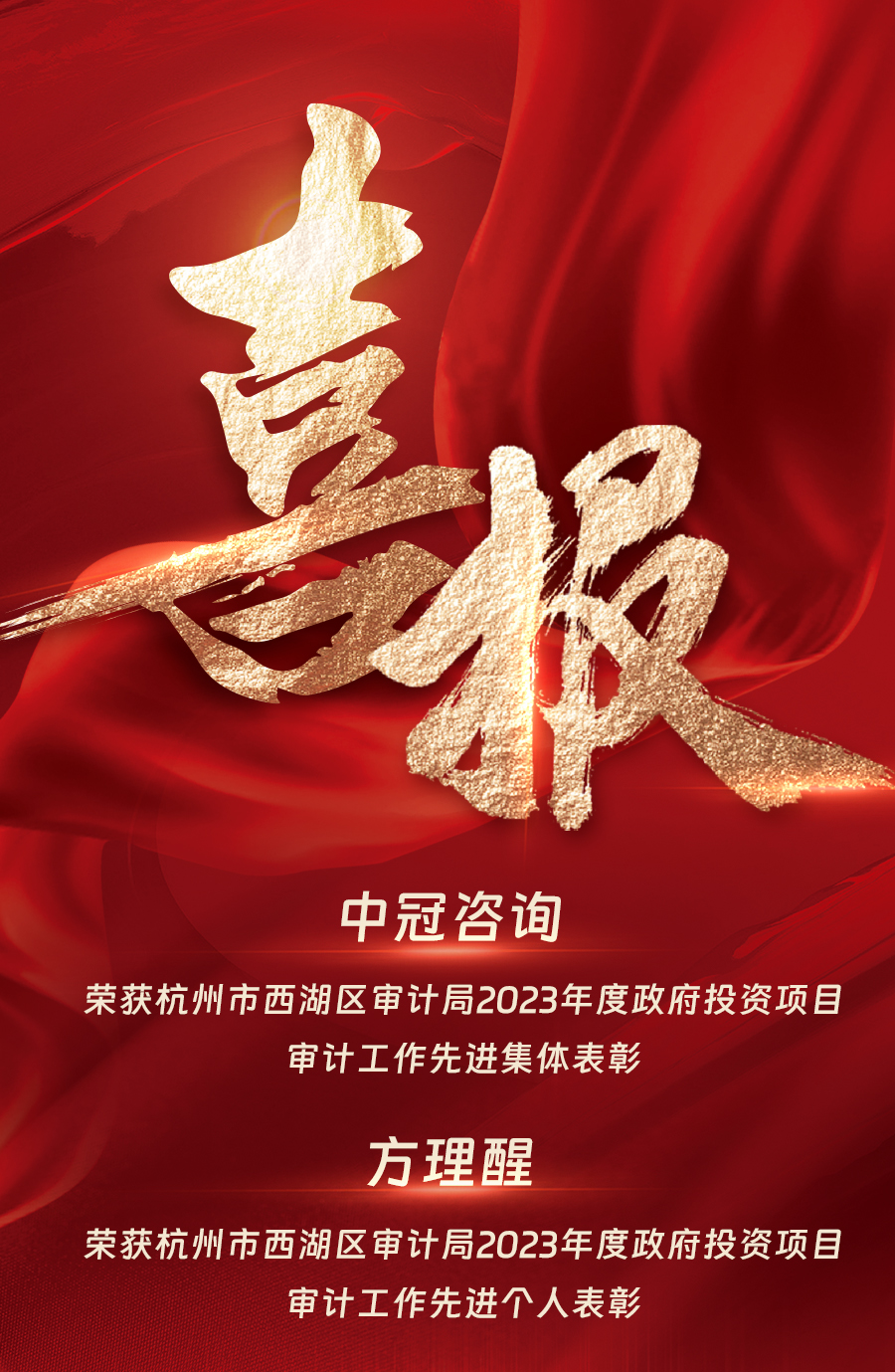 中冠喜報 | 我司榮獲杭州市西湖區(qū)審計局2023年度政府投資項目審計工作先進(jìn)集體和個人表彰