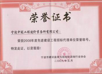 2008年度先進建設工程招標代理單位榮譽稱號-中冠榮譽-中冠咨詢-中冠工程管理咨詢有限公司