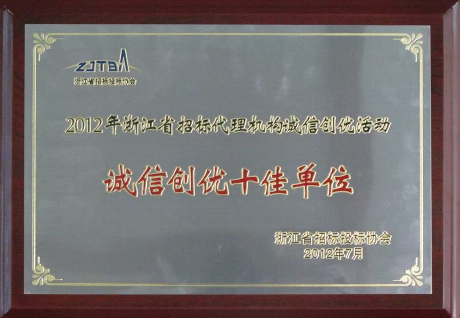 2012年浙江省招標(biāo)代理機(jī)構(gòu)“誠(chéng)信創(chuàng)優(yōu)十佳單位”