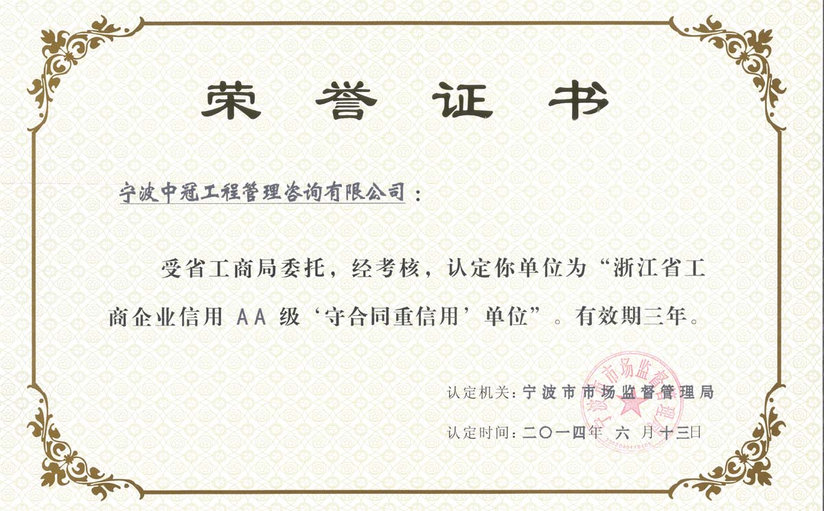 浙江省工商企業(yè)信用戶AA級(jí)‘守合同重信用’單位榮譽(yù)證書-中冠榮譽(yù)-中冠咨詢-中冠工程管理咨詢有限公司