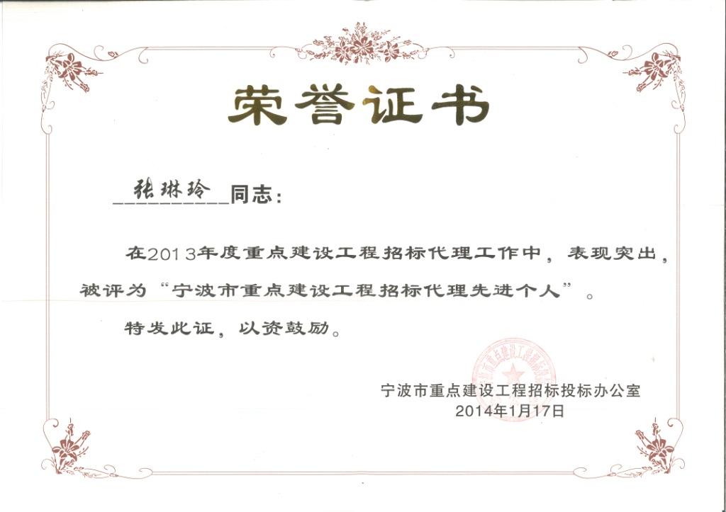 我公司張琳玲同志在2013年重點(diǎn)建設(shè)工程招標(biāo)代理工作中,被寧波市重點(diǎn)建設(shè)工程招標(biāo)投標(biāo)辦公室被評為“寧波市重點(diǎn)建設(shè)工程招標(biāo)代理先進(jìn)個人”。