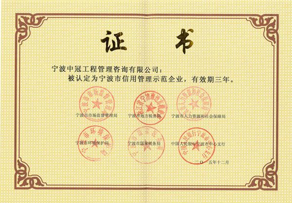 根據(jù)寧波市市場(chǎng)監(jiān)督管理局、寧波市地方稅務(wù)局、寧波市人力資源和社會(huì)保障局、寧波市環(huán)境保護(hù)局、寧波市國(guó)家稅務(wù)局、中國(guó)人民銀行寧波市中心支行,近期發(fā)布的《關(guān)于認(rèn)定2015年“寧波市信用管理示范企業(yè)”的決定》,我公司榮獲“寧波市信用管理示范企業(yè)”榮譽(yù)稱號(hào)。