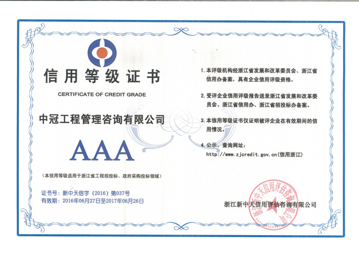 近期經(jīng)浙江新中天信用評(píng)估咨詢(xún)有限公司的評(píng)測(cè),我公司順利取得適用浙江省工程招標(biāo)投標(biāo)、政府采購(gòu)?fù)稑?biāo)領(lǐng)域“AAA”級(jí)信用資格的延續(xù)。