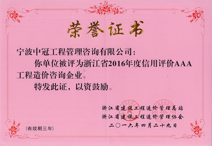 根據(jù)浙江省建設(shè)工程造價(jià)管理總站、浙江省建設(shè)工程造價(jià)管理協(xié)會(huì)近期公布的《關(guān)于公布浙江省2016年度工程造價(jià)咨詢企業(yè)信用評(píng)價(jià)結(jié)果的通知》,我公司榮獲“浙江省2016年度信用評(píng)價(jià)AAA工程造價(jià)咨詢企業(yè)”榮譽(yù)稱號(hào),有效期三年。 特此報(bào)喜! 辦公室2017年1月4日