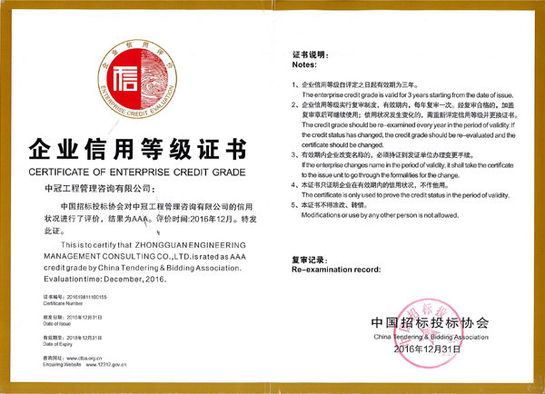 2017年1月19日,中國(guó)招標(biāo)投標(biāo)協(xié)會(huì)首批會(huì)員企業(yè)信用評(píng)價(jià)總結(jié)會(huì)及授牌儀式在北京舉行,我公司榮獲中國(guó)招標(biāo)投標(biāo)協(xié)會(huì) “企業(yè)信用評(píng)價(jià)AAA級(jí)信用企業(yè)”榮譽(yù)稱號(hào),此為該信用評(píng)級(jí)最高級(jí)別。有效期三年。