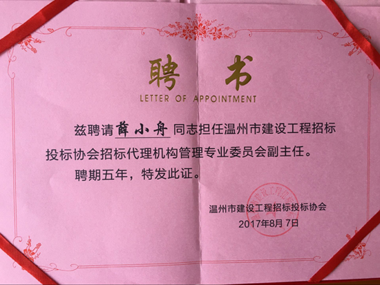 接溫州市建設(shè)工程招標(biāo)投標(biāo)協(xié)會(huì)通知,我公司薛小舟被聘任為溫州市建設(shè)工程招標(biāo)投標(biāo)協(xié)會(huì)招標(biāo)代理機(jī)構(gòu)管理專業(yè)委員會(huì)副主任,聘期五年。 特此報(bào)喜!