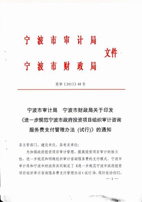 寧波市審計局、寧波市財政局文件 甬審[2013]48號 寧波市審計局 寧波市財政局關(guān)于印發(fā) 《進(jìn)一步規(guī)范寧波市政府投資項目組織審計咨詢服務(wù)費(fèi)支付管理辦法(試行)》的通知